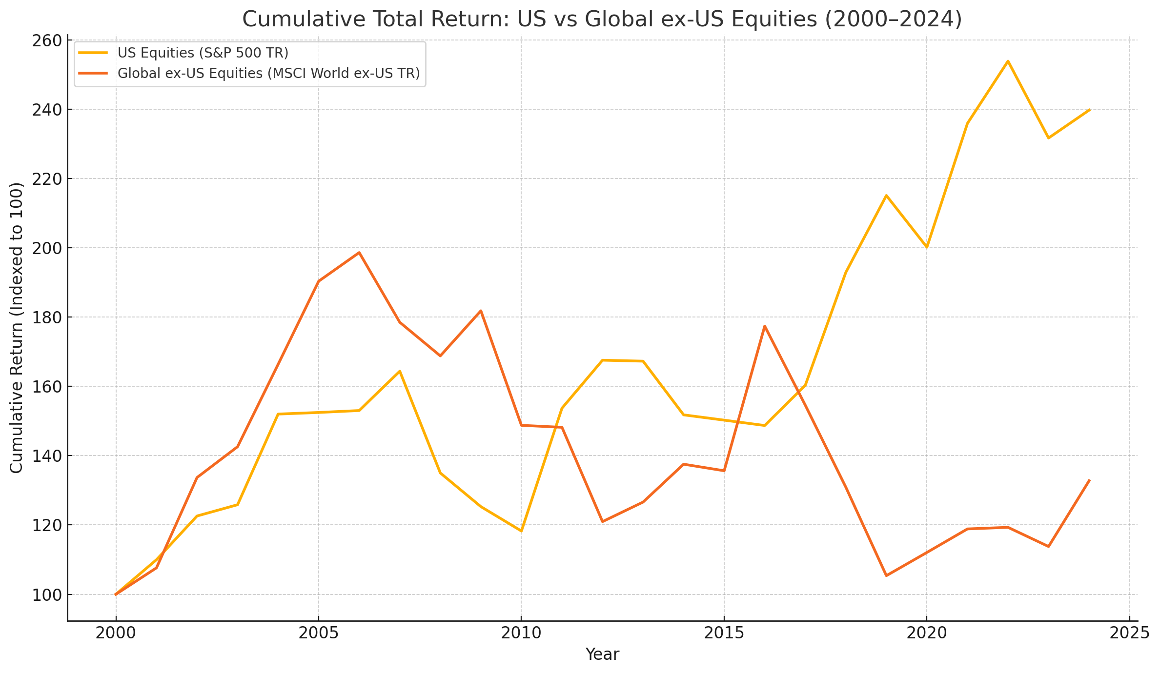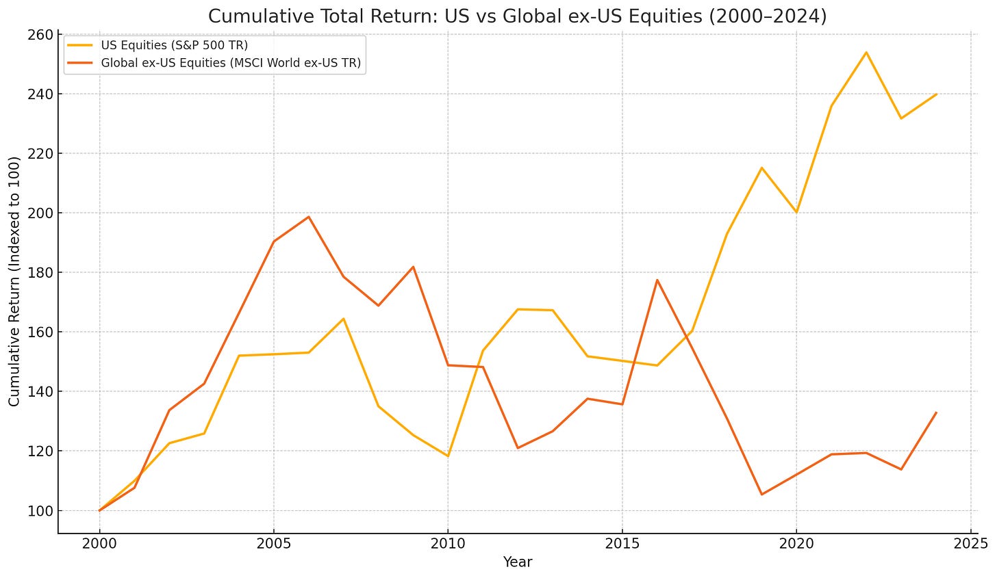 2008–2024: U.S. equities (S&P 500) dramatically outperformed